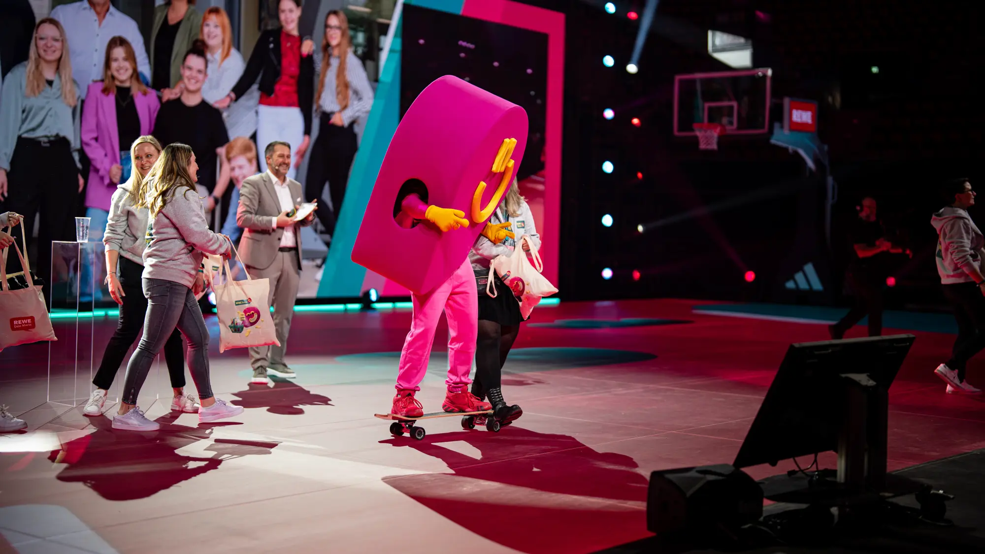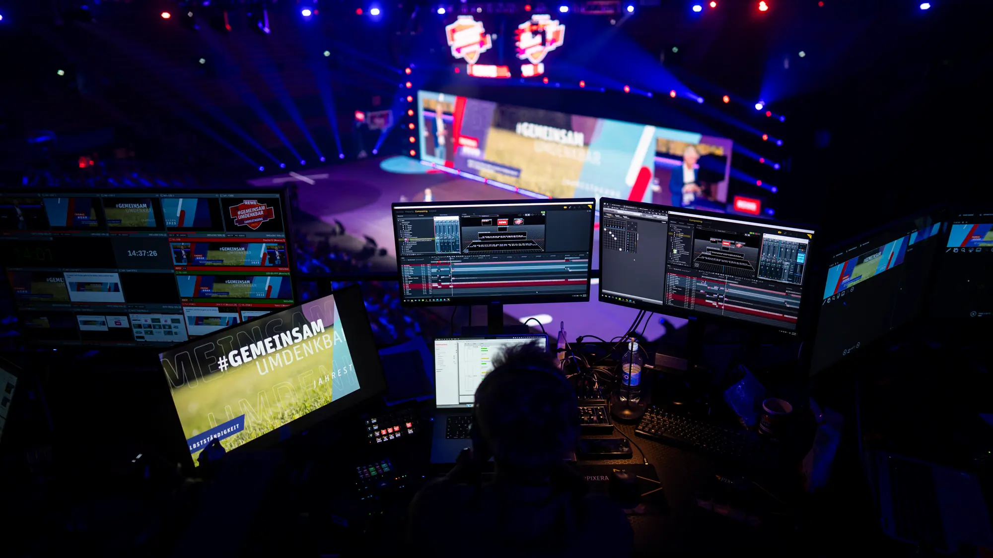 For the REWE JAV at BMW Park, we worked with a total of six Pixera servers – four provided by us and two from the venue. Our team was responsible for programming and operating the entire show, driving a complex setup that included the main LED wall (approx. 10,000 x 1,500 px), LED floor, LED ring, LED cube, and several projection surfaces.